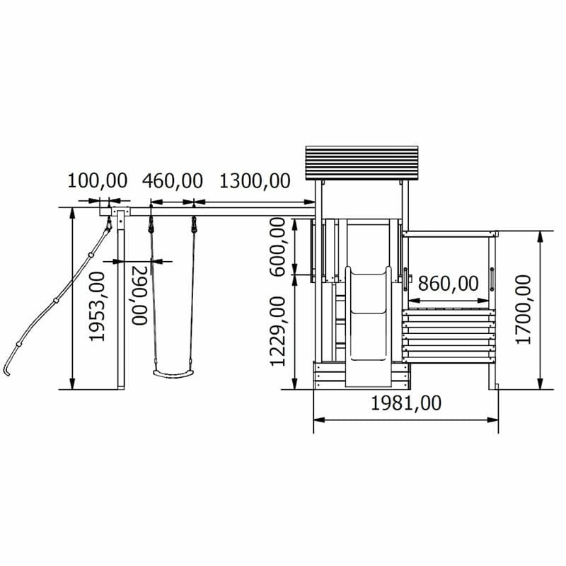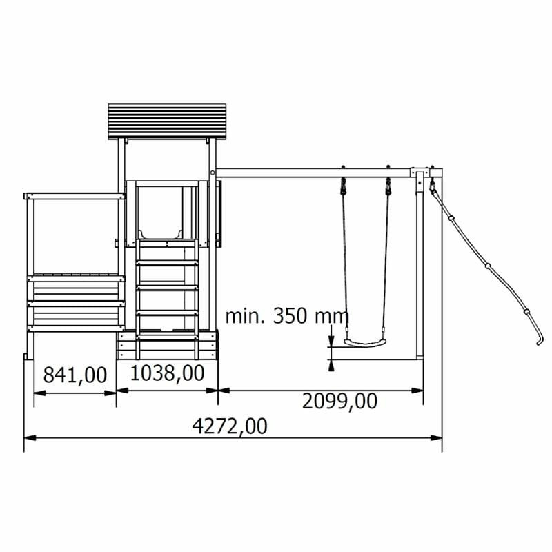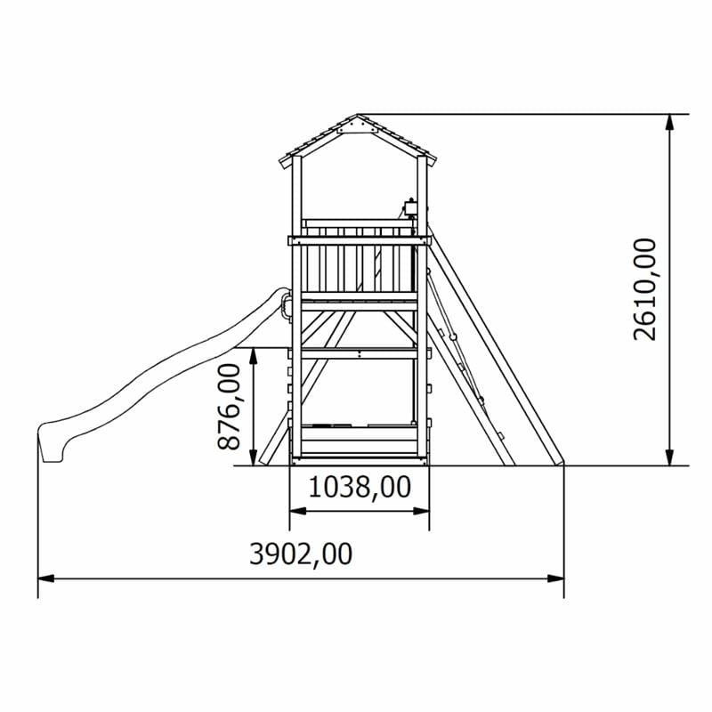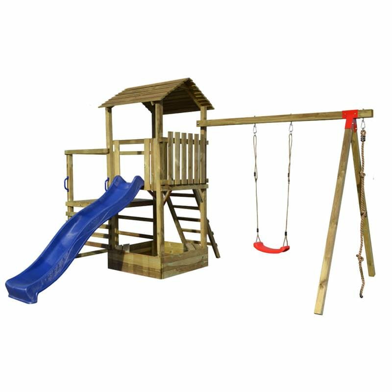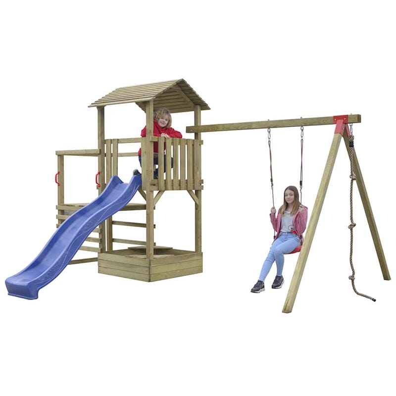Tuto multifukční dětskou hrací věž si Vaše děti určitě zamilují. Na hlavní věž s dřevěnou stříškou děti vylezou pomocí žebříku a dolů se pak dostanou sklouznutím po krásné skluzavce. Další zábavu si pak užijí na houpačce, můžou si zašplhat na laně nebo si hrát na pískovišti. Jednoduše ideální zábava pro každé dítě. Montáž žebříku je variabilní, je možné ho namontovat ze dvou stran.