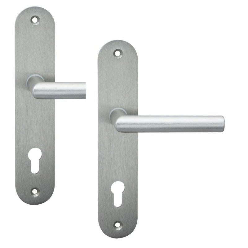 Dveřní kování COBRA Vision klika-klika PZ90 Nerez Oválné štítové kování s otvorem na vložku. provedení: klika-klika materiál: nerez povrch: nerez mat vratná pružina: ANO typ montáže: vruty použití: interiér ROZTEČ:90 mm ROZMĚRY: štít: 40 x 225 mm klika: 140 mm OBSAH BALENÍ: sadu na jedny dveře (1 pár štítů a klik) spojovací materiál (čtyřhran, vruty apod.)