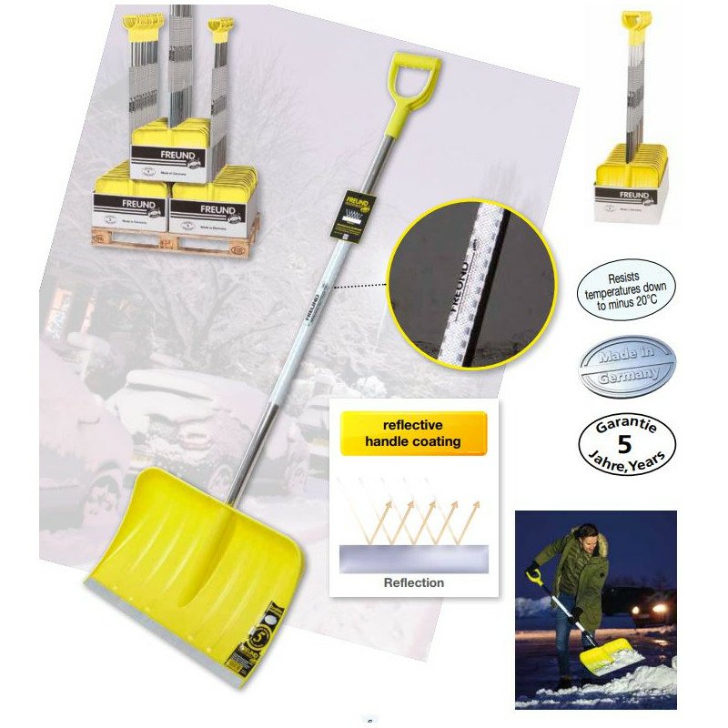 Plastové hrablo na sníh s hliníkovou rukojetí a reflexní plastový povlak • Plastové hrablo 35 x 54 cm • neonově žlutá, spodní hrana s hliníkovou lištou • oválná hliníková trubková násada • s reflexním krytem násady • žlutá plastová D-rukojeť • výrazné barvy a odraz světla • perfektní viditelnost ve tmě • ideální v blízkosti silničního provozu • Hmotnost: 1,5 kg