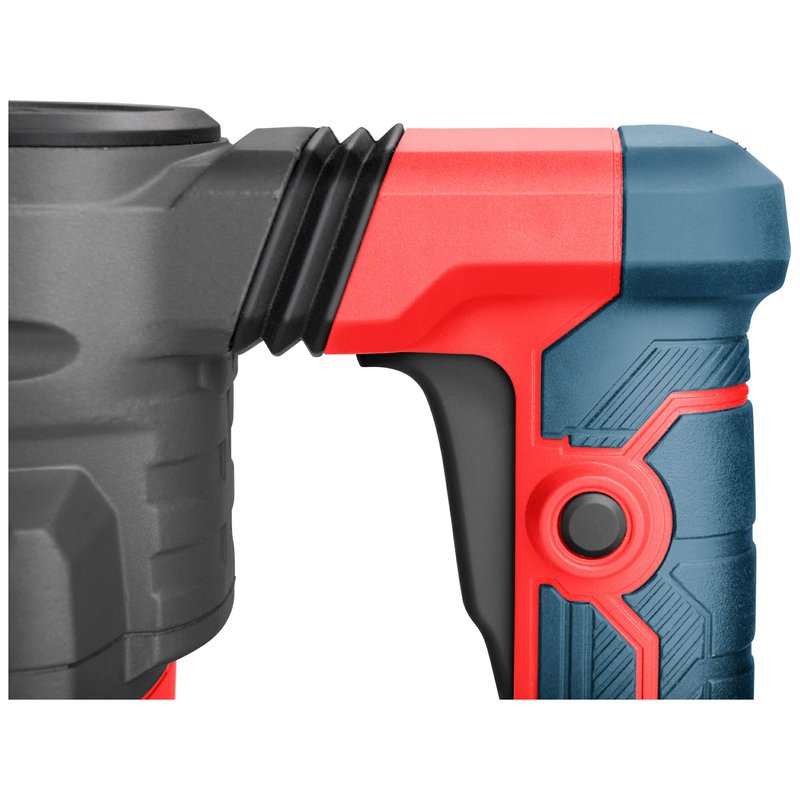 Sekací kladivo SDS MAX s energií úderu 15J je výkonný stroj určený pro stavební a demoliční práce. Využívá se zejména tam, kde běžné vrtací kladivo nestačí – při bourání betonu, kamene nebo cihel. Sekací kladivo s výkonem 15J představuje ideální kompromis mezi silou a ovladatelností. Taková hodnota rázové energie umožňuje rozbíjet silné vrstvy betonu, ale zároveň je možné s nástrojem precizněji pracovat při odsekávání dlaždic, omítek nebo lepených povrchů. V kombinaci s plochým nebo špičatým sekáčem se využívá pro demolici betonových základů, zdiva, schodů nebo podlah. Se širším sekáče lze efektivně odstraňovat staré obklady či asfaltové vrstvy. Konstrukce stroje je navržena tak, aby zajistila maximální přenos rázové energie do nástroje. Antivibrační systém minimalizuje vibrace přenášené na uživatele, což zvyšuje komfort práce a chrání zdraví obsluhy. Díky tomu může uživatel pracovat delší dobu bez výrazné únavy. Rukojeť potažena protiskluzovým materiálem a tvarována tak, aby umožňovala pevné uchopení i při delší práci, což také přispívá ke zvýšení komfortu, jistoty držení při práci a tlumení vibrací. Systém SDS MAX byl vyvinut pro práci s většími vrtáky a sekáči. Na rozdíl od menšího systému SDS Plus, který se používá u lehčích kladiv, má SDS MAX větší průměr stopky a robustnější konstrukci. To umožňuje přenášet větší energii úderu, zajišťuje pevnější uchycení nástroje a zachovává vysokou účinnost i při dlouhodobém zatížení. Průměr stopky je 18 milimetrů, což zvyšuje odolnost vůči ohybu i mechanickému opotřebení. Spínač je vybaven zámkem pro nepřetržitý provoz, což usnadňuje sekání větších ploch bez nutnosti neustále držet spínač. Otočná přední rukojeť v rozsahu 360° umožňuje přizpůsobit polohu rukojeti vzhledem k pracovní poloze kladiva.