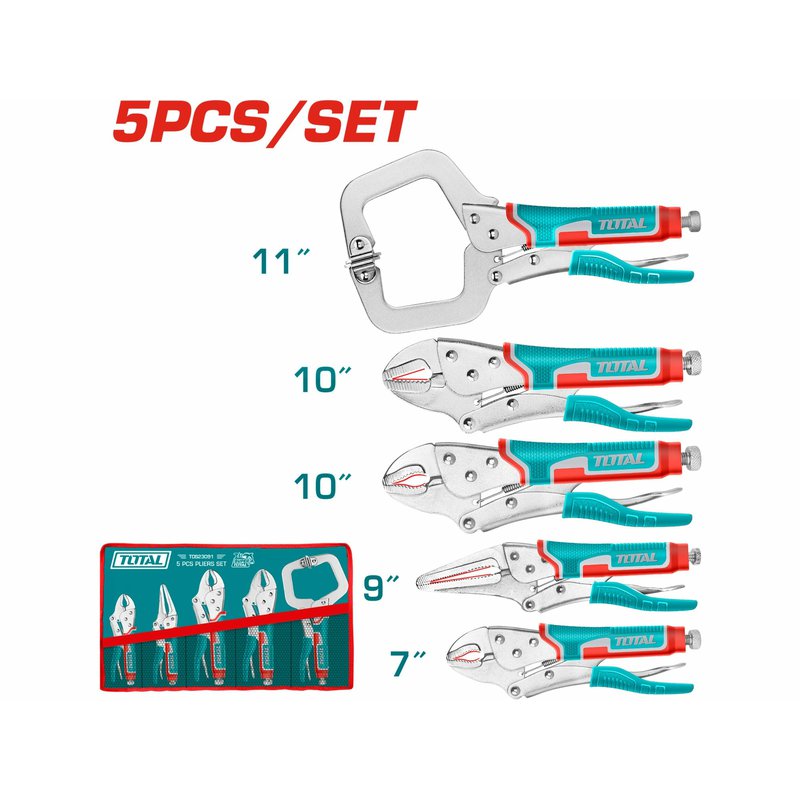 Sada rychloupínacích kleští je zabalena v rozkládacím obalu z PVC. Obal má 5 kapes, pro každé kleště jednu. Po zamotání obalu do ruličky je obal vybaven provázkem pro zavázání. Jednotlivé kleště jsou vybaveny sklolaminátovým krytím rukojetí, což usnadňuje úchop a práci s nůžkami. Sada obsahuje tyto typy kleští: 1 ks 180mm kleště se zahnutými čelistmi 1 ks 230mm kleště rychloupínací štípací s dlouhými čelistmi 1 ks 230mm kleště rychloupínací štípací se zahnutými čelistmi 1 ks 250mm kleště s přímými čelistmi 1 ks 280mm kleště rychloupínací C