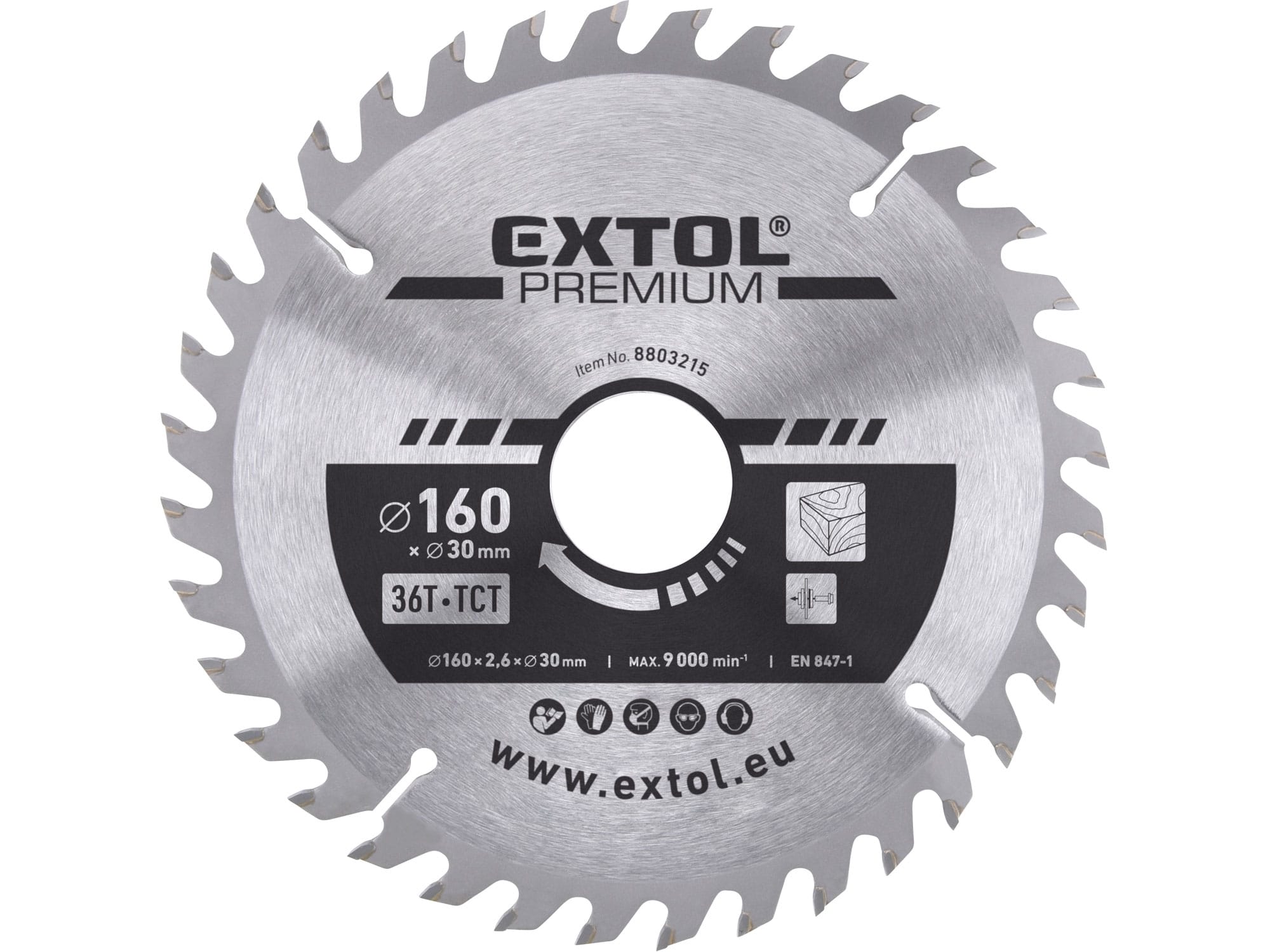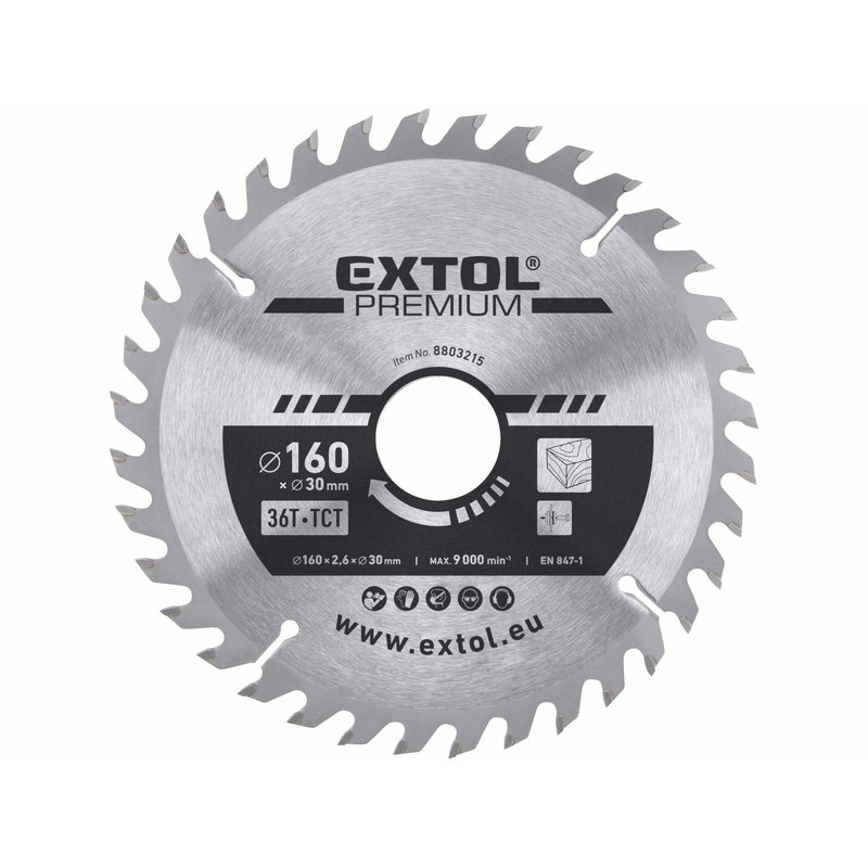 Technické parametry:_____O 160x2,6x30mm, 36T Značka:__________________EXTOL PREMIUM Doplňující parametr:_____tloušťka těla kotouče 2,0mm, max.ot. 9000/min.