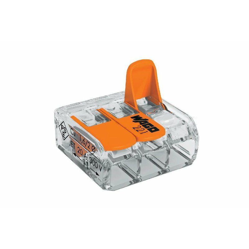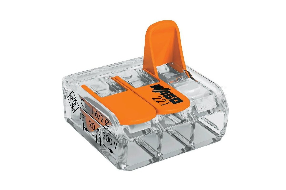 WAGO svorka 221-413 3x4 patří mezi vůbec nejoblíbenější svorky na trhu. Vyniká velmi jednoduchým použitím, jelikož je bezšroubová a kontakt zajistíte pružinou. Je také rozměrově velmi kompaktní a spojíte s ní vodiče s průřezem 0,14 až 4 mm2.