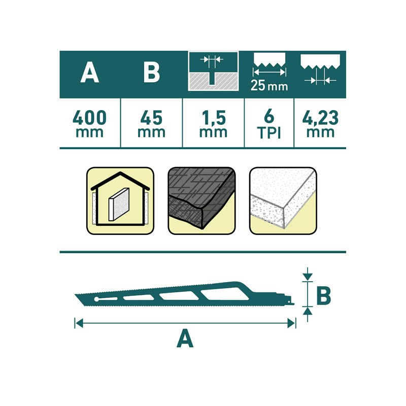 plátek lz použít na nejrůznější měkké izolační hmoty jako minerální vaty, polystyren atd. plátek má oboustranné ostří (6zubů/palec) a hrotová strana je velmi ostrá, takže s ní lze jednoduše proniknout do řezaného materiálu