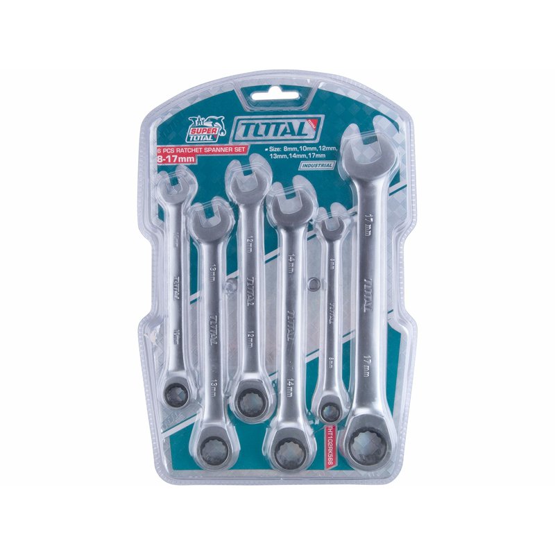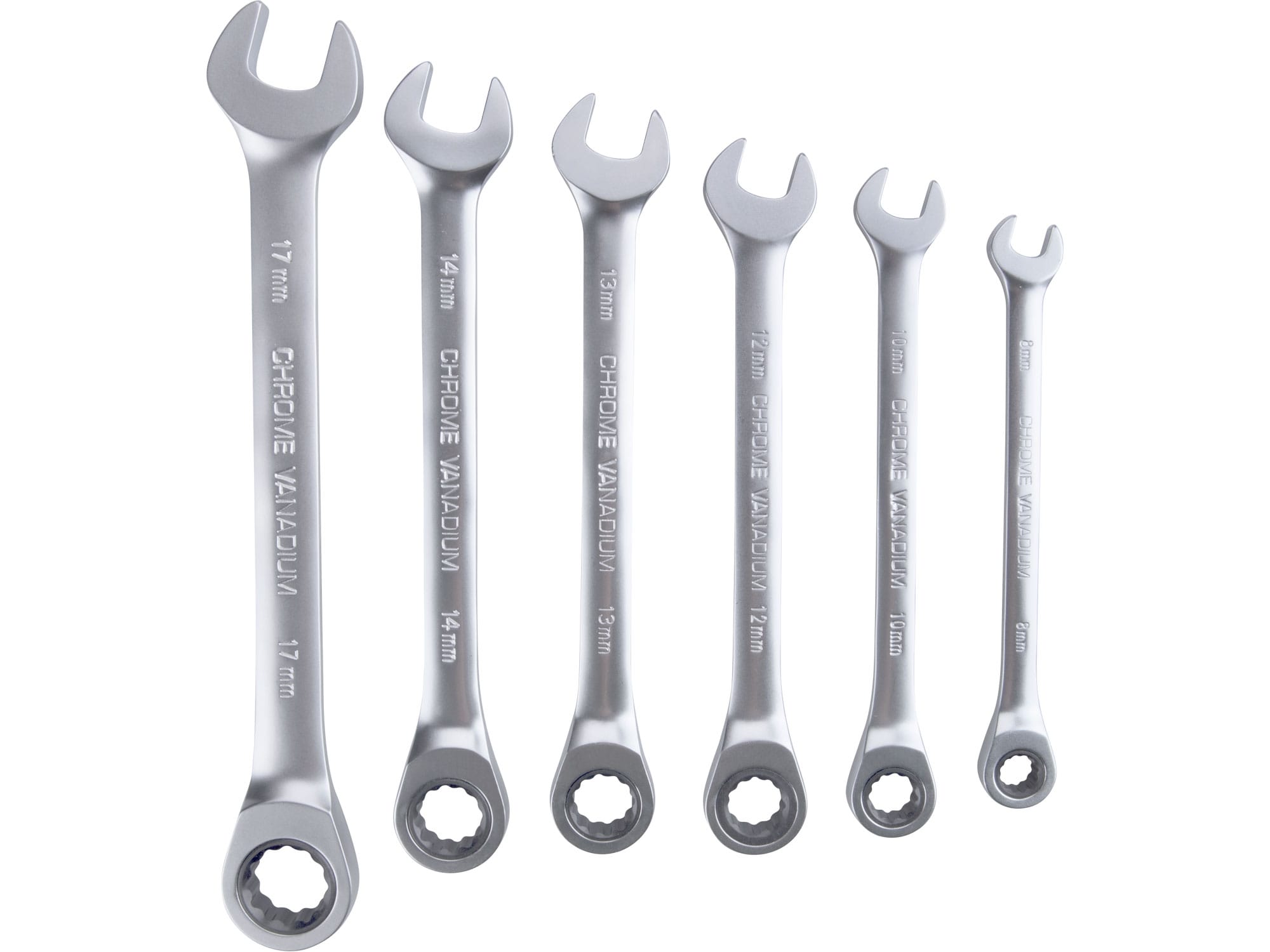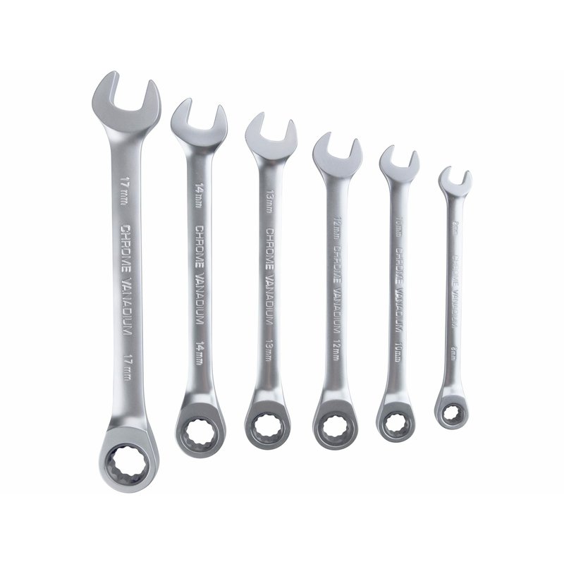 Sada 6ks ráčnových očkoplochých klíčů. Vyrobeno z vysoce kvalitní chrom-molybdenové oceli. Jemně leštěno. Velikos klíčů: 8mm,10mm,12mm,13mm,14mm,17mm