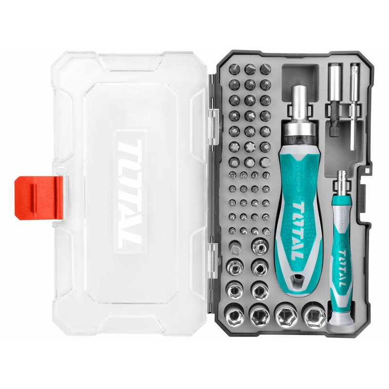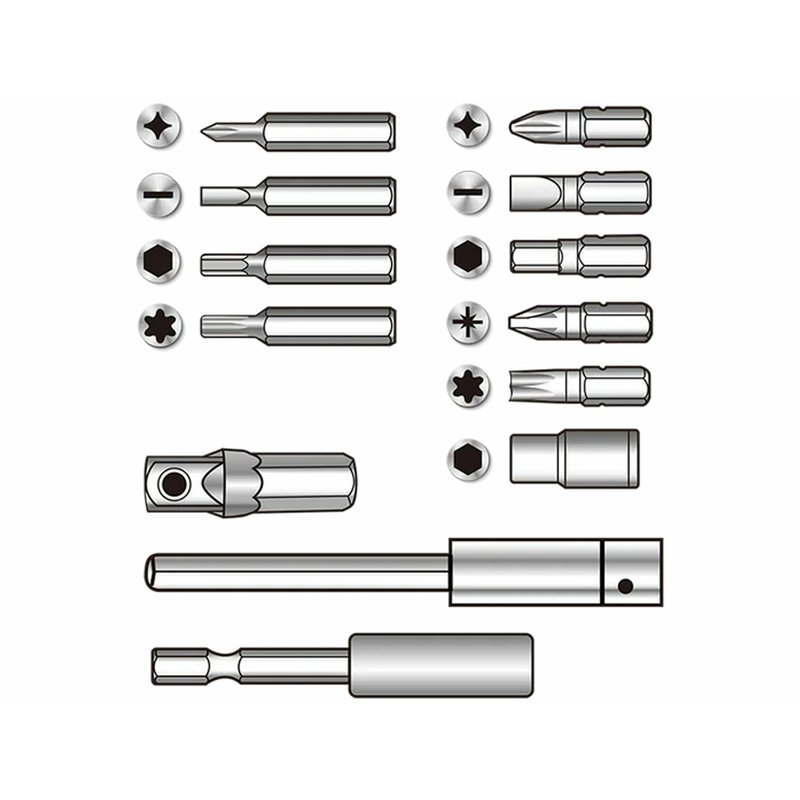 Kombinováná sada řáčnového šroubováku s 21ks hrotů a 9ks ořechů společně s hodinářským šroubovákem s 20ks hrotů.