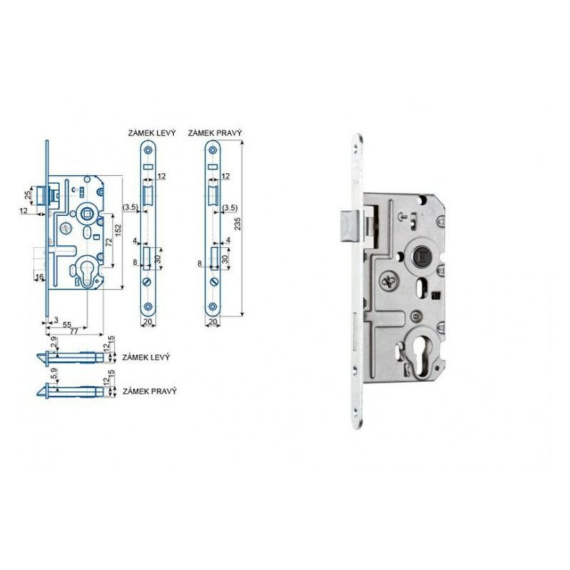 Zadlabací zámek HOBES K 321 Levý 72/77 dorn 55 vložkový Zinek