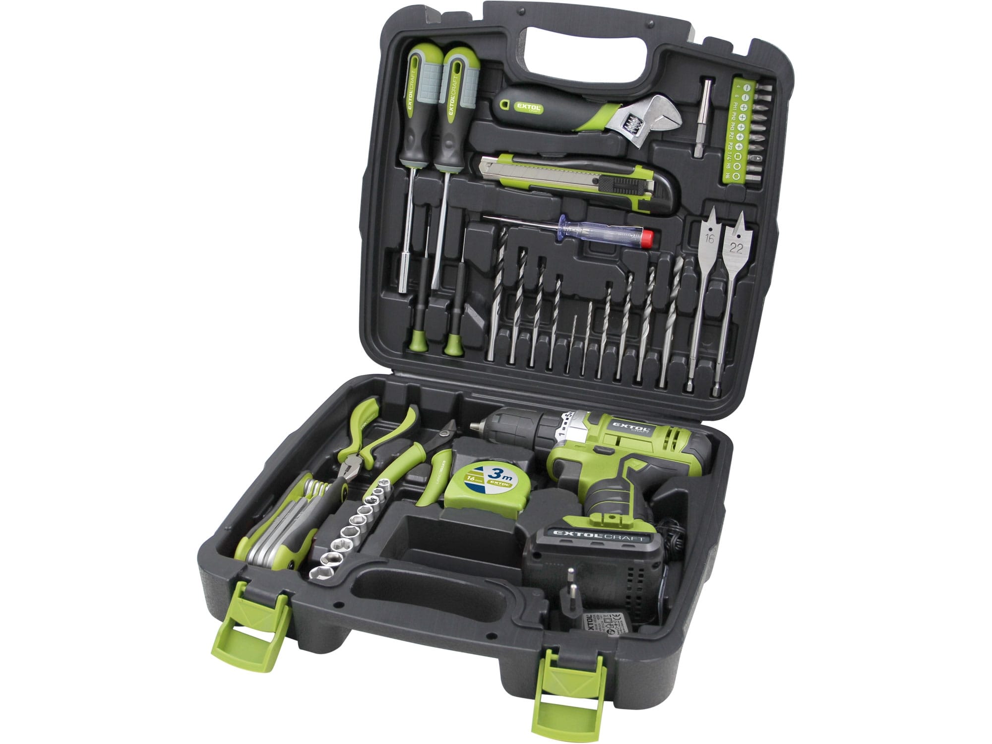 Praktická sada pro domácnost obsahující aku vrtací šroubovák s vrtáky a bity a základní nářadí. Lehký vrtací aku šroubovák je určen k dotahování a povolování šroubů či vrutů, dále k vrtání do dřeva, kovu a plastů. Díky Li-ion akumulátoru je možné šroubovák kdykoliv dobíjet, aniž by se tím snižovala kapacita akumulátoru. Li-ion akumulátor ztrácí energii vlivem samovybíjení velmi pomalu a vydrží dlouho nabitý. Tech. parametry baterie 12V Li-ion kapacita baterie 1300mAh otáčky I. 0-400/min, II. 0-1500/min L/P chod ano rychloupínací hlava plastová 3/8" průměr vrtáku 0,8-10mm stupňů utah. momentu 21+vrtání max. utahovací moment 18Nm nabíjení baterie cca 4-5h v kufru ano hmotnost s baterií 1kg Příslušenství vrták do dřeva 16-22mmvrták do kovu 2-3-4-5-6-7mmvrták do zdi 4-5-6-8mmšroubovák hodinářský 50mm - (-)2,5mm, PH00šroubovák (-) 5x100mmšroubovák na hroty 1/4”x100mmhroty 25mm - (-)4-6mm, PH1-2-3, PZ1-2, HEX 4-5mm, adapter 1/4” držák hrotů 60mmhlavice 5-6-7-8-9-10-11-12-13mmnůž ulamovací 18mmzkoušečka 100-250Vkleště 125mm - kombinační, štípacíklíč nastavitelný 150mmimbus - HEX 1,5-2-2,5-3-4-5-6-8mmmetr 3m x 16mm